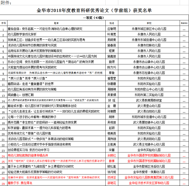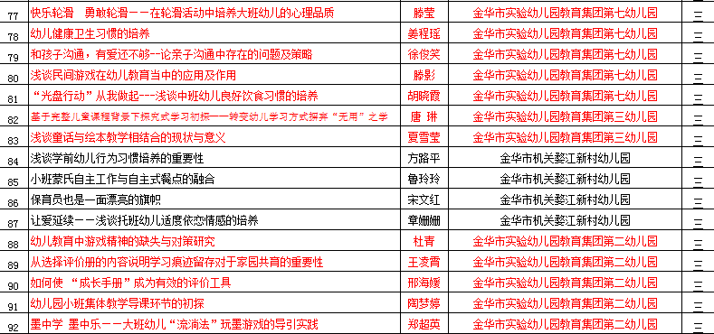 據金(jīn)華教育網5月(yuè)24日(rì)發布的(de)金(jīn)華市(shì)教育科(kē)學研究所《關于金(jīn)華♦市(shì)2018年(nián)度教育科(kē)研優秀論文(wén)、金(jīn)華市(shì)第十三屆教育科(kē)研 “提質減負”專題Ω優秀論文(wén)評比結果公示的(de)通(tōng)知(zhī)》,公司下(xià)屬的(de)金(jīn)華市(shì)實驗幼兒(ér)園教育集團收獲頗豐,共有(yǒu)19篇論文(wén)在此>次評比中獲獎,其中,八園的(de)餘曉紅(hóng)、滕婵,三園的(de)鄧詩蕊和(hé)九園的(de)邵豔花(huā)榮獲一(yī)等獎(全市™(shì)共43篇一(yī)等獎論文(wén)),另有(yǒu)3位老(lǎo)師(shī)的(de)論文(wén)獲得(de)←二等獎、12位老(lǎo)師(shī)的(de)論文(wén)獲得(de)三等獎。